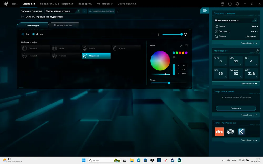 Подсветка клавиатуры имеет 7 динамических режимов (в 5 из которых можно менять цвет, а в остальных двух он переливается автоматом) и статический режим, где можно выбрать цвет для каждой из 4-х зон клавиатуры.