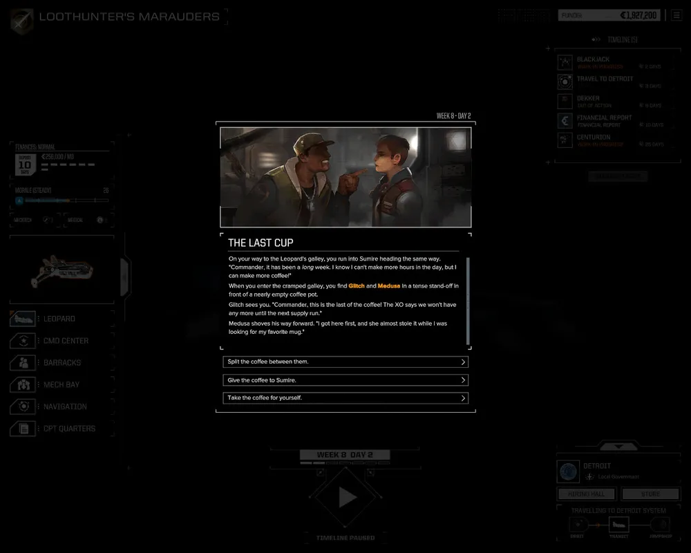 Когда ваш транспорт болтается в космосе вы можете натолкнуться на пиратов. Или «по ошибке» получить ценный груз. Или ваш инженер запросит разрешение на переоборудование отсеков для увеличения эффективности работы. И всякий раз у вашего решения, даже если вы будете выбирать, кому отдать последнюю чашку кофе в конце особенно тяжёлого рабочего дня, будут последствия. В основном, в виде пониженных/повышенных характеристик у наёмников и экипажа.