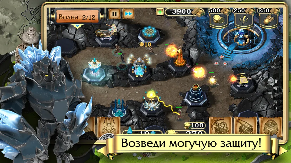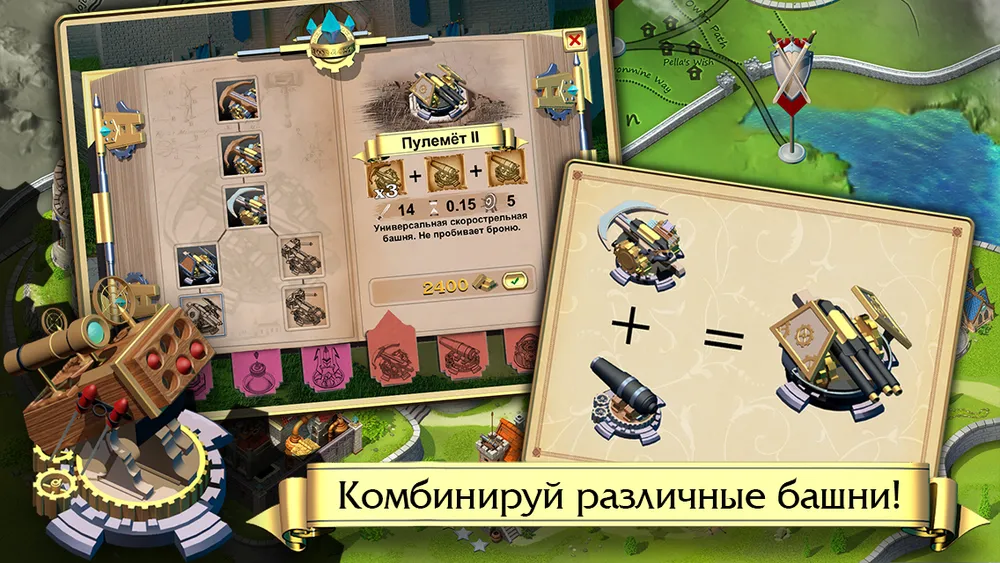 Во-первых, башни строятся комбинированием механических и магических элементов. На старте их четыре, по мере развития становится шесть. Три элемента относятся к механике, три – к магии, и они позволяют создать сорок два вида башен с уникальным дизайном и характеристиками. Во время сражения можно бесплатно разобрать любую башню обратно на элементы и полностью перестроить свою оборону. Например, из башни третьего уровня можно получить три башни первого, и наоборот. Иногда элементы выпадают из поверженных крипов (зачем крипам элементы? куда они их несут?), что добавляет динамики. Так что на вопрос, можно ли грабить корованы, наш ответ – уверенное да.