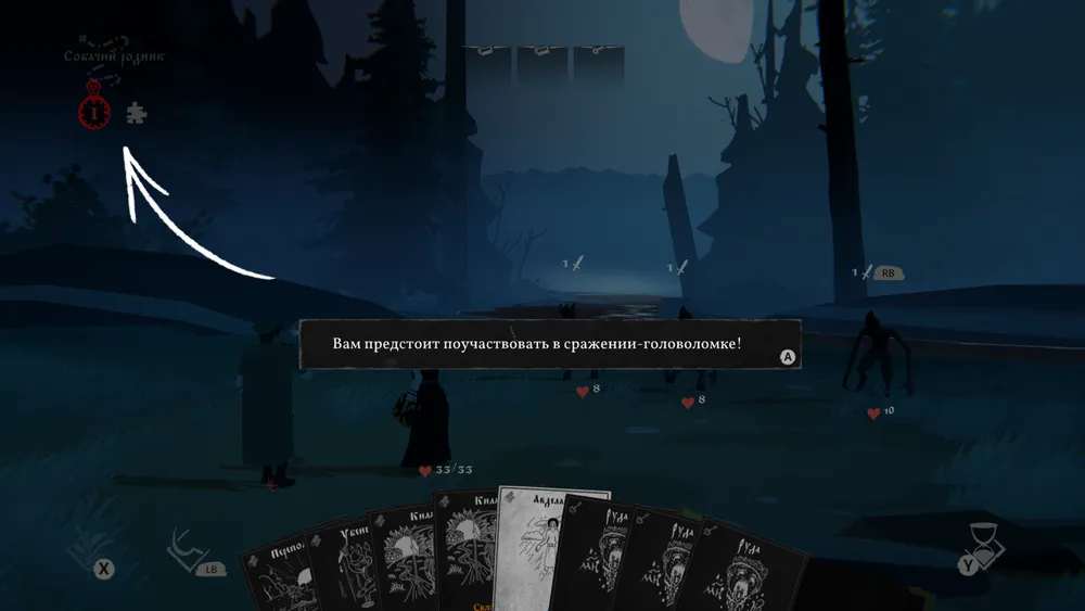 Кроме обычных боев в игре имеются сражения-загадки. И тут все гораздо интересней. В них нельзя использовать расходные материалы, из снаряжения убираются все обереги, отключаются все прокачанные навыки и даже выбранные в колоду карты исчезают. Вместо этого героиня получает набор специфических карт, и различные условия победы, например, ограничение ходов или обязательное применение защиты против смертоносных атак. Игроку следует подобрать правильную комбинацию для заговора чтобы победить. Данный режим, по моим ощущениям, вышел не менее увлекательным, при том в нем отсутствует недостаток со случайным набором карт. Думаю, такой вариант сражений хорошо подошел бы и сюжетным боссам вместо обычных карт. Хотя бы в первые и самые опасные формы босса решались головоломкой, а добивать ослабевшего уже обычными картами.