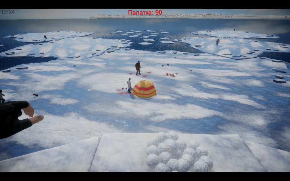 Стоит отметить, что размер инвентаря ограничен и состоит из восьми ячеек. Однако не все предметы занимают одинаковое количество ячеек. Например, в одной ячейке помещаются 2 бутылки сока, но вот с едой сложнее: 1 ячейка – 1 единица пищи (шоколадный батончик или рыба). С лекарствами ситуация такая же как и с жидкостями. Также 1 ячейку занимает патрон для сигнального пистолета спасателям. При исследовании льдин можно найти и крупногабаритные предметы, например, газовый баллон, занимающий 4 ячейки инвентаря и «съедающий» половину полезного пространства. Всё, что не нужно для оперативного использования (небольшой запас воды и еды) можно хранить в палатке или даже выбросить около палатки – они никуда не денутся. Для фонарика (при ночной прогулке по льдинам) и сигнального пистолета предусмотрены отдельные слоты. Так что полезные инструменты не будут занимать лишнего места в инвентаре.