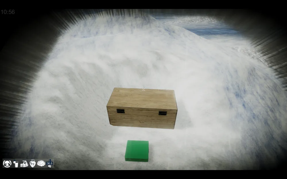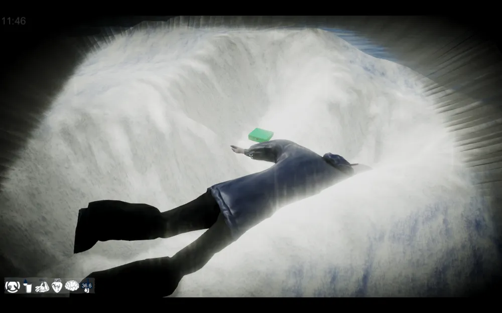 Также в левом верхнем угле отображается внутриигровое время, приводящее к смене дня и ночи, погода тоже меняется, примерно на третьи сутки начинается сильный буран. Не обнаружив фонарика лучше не уходить далеко от палатки после 17:00, иначе в темноте можно не добраться до неё в целости.