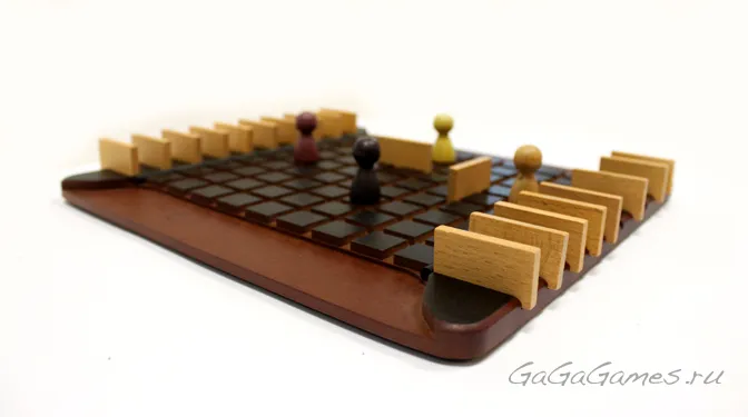 У противника или противников (играть можно вдвоем ли вчетвером) та же цель. В чем же интрига? Игроки идут навстречу друг другу. В свой ход можно либо сместиться на одну клетку, либо поставить одну из имеющихся на руках (из 4х или 8ми) перегородок на пути соперника, если на вашем пути стоит соперник, то можно через него перепрыгнуть, преодолев таким образом сразу две клетки. Перекрывать путь совсем – нельзя. Всегда должен быть хотя бы один вариант прохода до цели. Вся соль в том, что, преграждая путь сопернику, зачастую мешаешь и сам себе. Даже если ваша перегородка вроде бы и не лежит на пути, соперники не преминут ее приспособить уже для своего коридоростроительства, и вот уже приходится тратить 6 ходов, обходя собственный барьер.