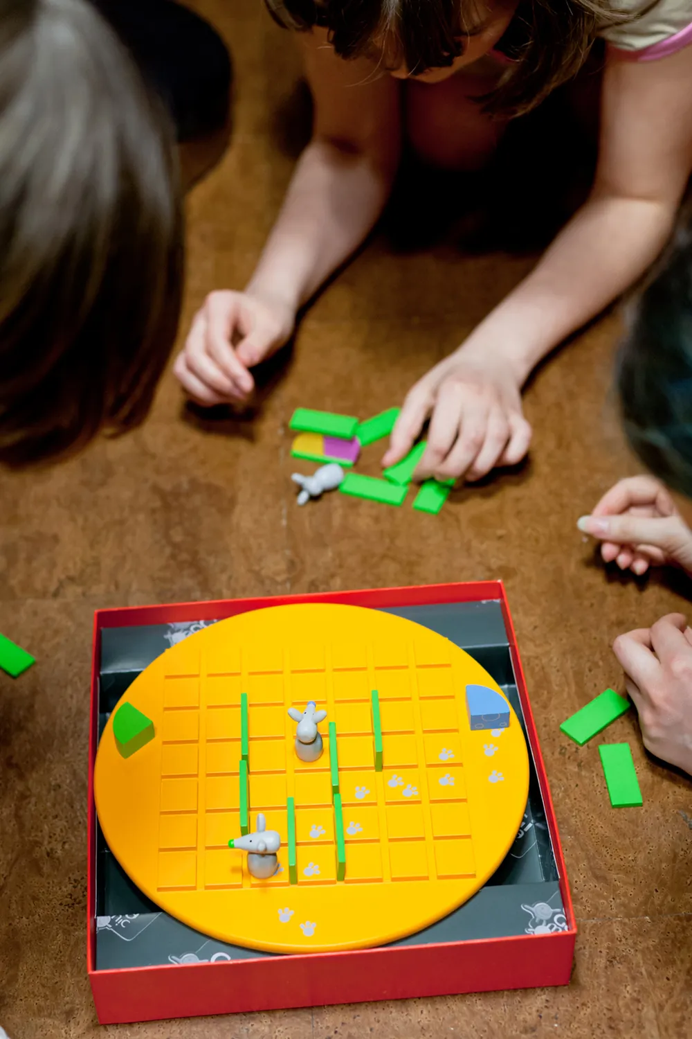 Все игровые элементы выполнены из дерева, и довольно плотно покрашены в яркие цвета, чтобы юным игрокам было веселее. Каждая мышка и каждый кусочек сыра обернуты бумагой и вместе с перегородками сложены в бархатистый мешочек, но распаковка прошла столь стремительно, что я не успела это запечатлеть.