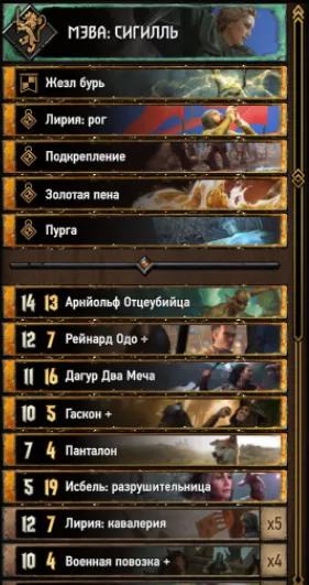 - - исключить из колоды все слабые отряды, сила которых меньше 9 – 10 (в большинстве случаев это поможет нейтрализовать способность лидера нильфгаардцев), правда можно сделать 1 – 2 исключения для карт с хорошими способностями, например, «Гесо: пехотинцы», «Исбель: разрушительница», «Панталон»;