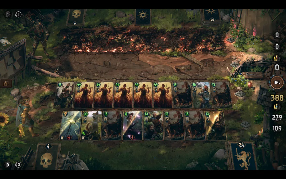 Здесь как я уже писал ранее нам необходимо собирать ресурсы для постройки лагеря, укрепления своей колоды, сбора рекрутов. Все спорные ситуации в игре решаются розыгрышем партии в гвинт. Причём, если в первых трёх главах в подавляющем большинстве случаев нам предлагаются усечённые партии – так называемый «Короткий бой», где требуется одержать победу только в одном раунде, то начиная с четвёртой главы наоборот, чаще будут вестись обычные партии с максимум тремя раундами, где требуется одержать победу в двух.