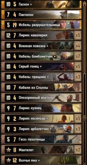 - сделать упор в колоде не на нанесении максимального урона, а на усилении других карт, например при использовании способности «верность», или активирующихся при перемещении карт, например, включив максимально возможное число таких карт, как «Лирия: косиньер», «Серый гонец»+«Военная повозка», «Лирия: кавалерия»;