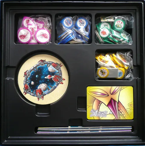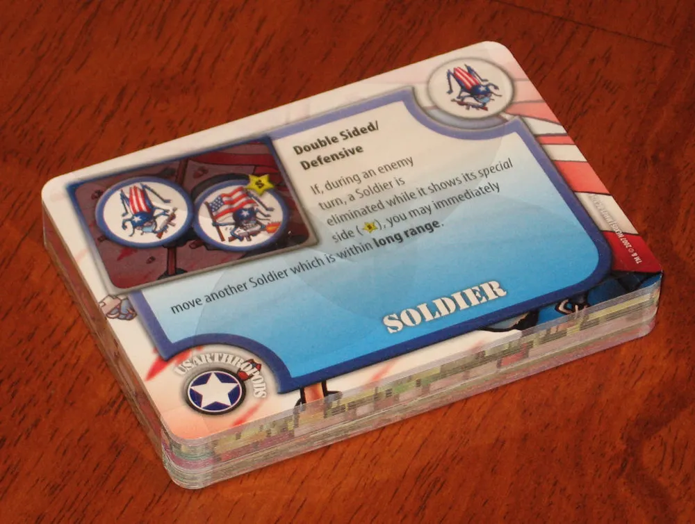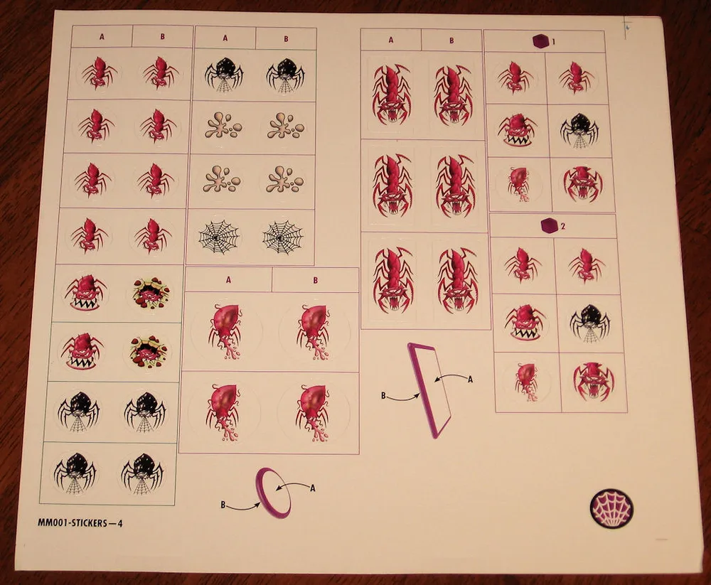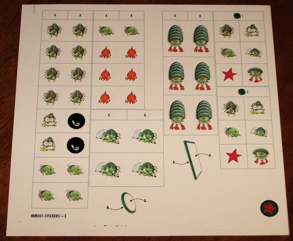 Стикеры предназначены для наклеивания на жетоны армий. Не спрашивайте меня зачем это сделано так - я не знаю. Лично мне кажется что лучше было бы сразу наклеить их ещё на заводе. У меня эта монотонная расклейка по жетончикам заняла где-то 30 минут. Зато я почувствовал себя пятиклассником :) Сами стикеры - самые обычные наклейки. Ничем плохим или хорошим не выделяющиеся. Арт на них качественный, красивый и четкий. С наклейкой так же проблем не должно возникнуть, единственное что необходимо соблюдать разделение сторон фишки на А и Б: некоторые жуки имеют разные стороны с разными свойствами.