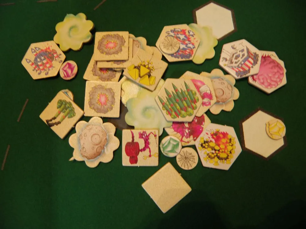 Карты делятся на информационные, с описанием каждого юнита и на карты эволюции, необходимые во втором режиме игры (об этом позже). Карты стандартного размера и превосходно влезают в обычные протекторы. Арт и печать на картах... ну вы в общем поняли что эти два пункта у FFG всегда на высоте и в этой игре в частности. Материал у карт - неплохие пластиковые болванки. единственный минус - они ОЧЕНЬ скользкие. я пока рассматривал их умудрился несколько раз рассыпать...