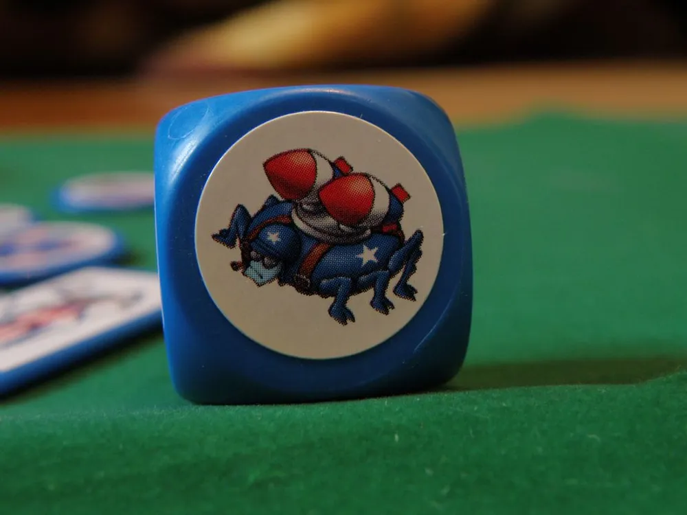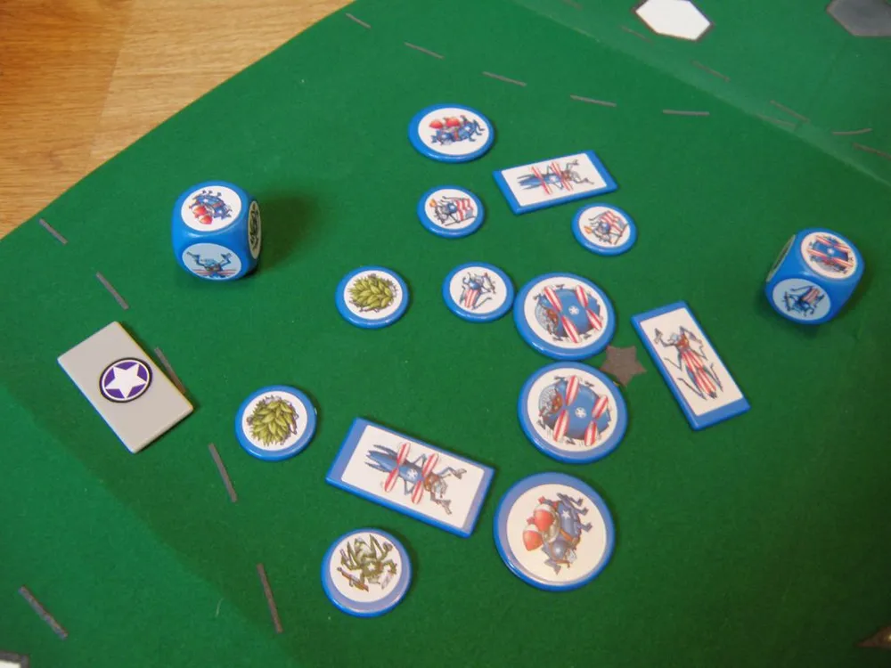 Игроки по очереди бросают кубики действий (action dice), который показывает какие два жука (точнее породы жуков) из его армии могу действовать в этот ход и прыгает этими жуками в атаку.