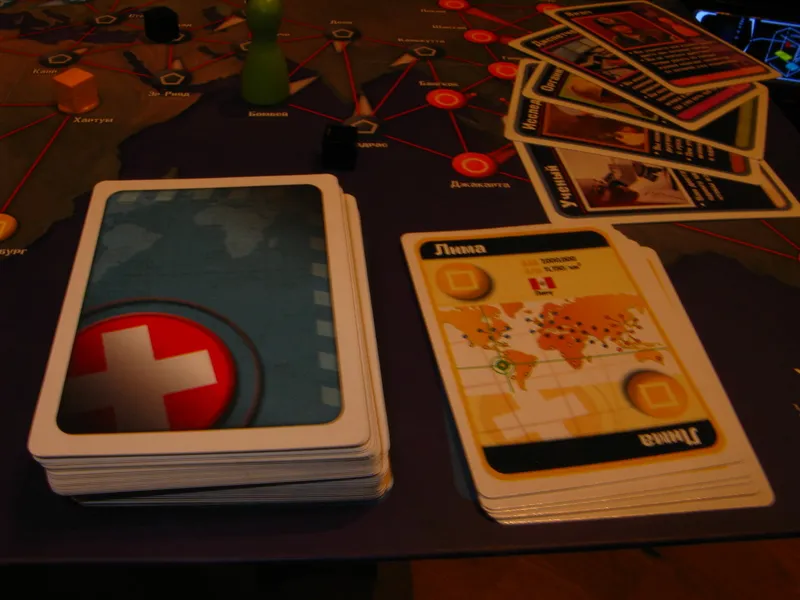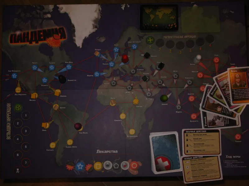 Какой город изображен на карте - в том городе и появляется кубик инфекции. Естественно соответствующего цвета. В случае, если вовремя не обратить внимание (наберется более 4х кубов) на болезнь в городе, то может случиться прорыв и игроки приблизятся на один шаг к поражению (из 10). Что бы этому помешать, наши доблестные герои, которые сами по себе обладают некоторыми спец способностями, например: переместиться в любой город или вылечить не один куб инфекции а несколько; так вот, наши герои занимаются сдерживанием инфекции, с помощью карт Лечения: