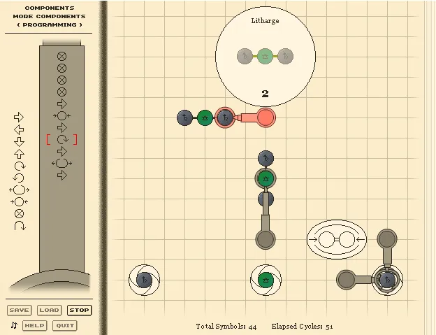 Расположив на поле манипуляторы, и выбрав их нужную длину и ориентацию, надо обязательно запрограммировать их движение. Они должны перемещать "атомы" по полю от одного глифа к другому или передавать их друг другу, при этом "атомы" или молекулы-соединения изменяясь в глифах, в конце цикла должны попасть в нужной ориентации в зону выгрузки. Надо подобрать время и вид движения каждого манипулятора, синхронизируя их так, чтобы они работали в унисон с остальными частями собранного устройства.