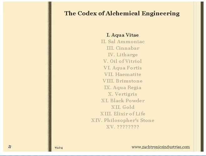 В рукописи хранятся знания и инструкции по перемещению, объединению и преобразованию различных алхимических "элементов". Также коротко описан ряд инструментов для управления алхимическими элементами. Инструменты могут и должны быть запрограммированы, чтобы циклично проделывать определенную последовательность действий.