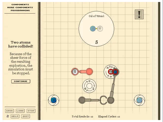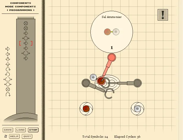 В игре в процессе синтезирования алхимического состава два “атома или сборки из этих “атомов” могут быть рядом друг с другом, но нельзя, чтобы они соприкасались друг с другом. Это означает, что программируя каждый манипулятор, вы должны определить время действия и паузы для каждого инструмента, чтобы иметь должным образом функционирующую машину.