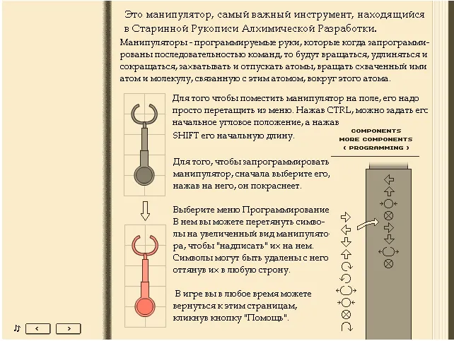 При входе в геймплей на трех страницах кратко излагаются основы игры, и идет знакомство с элементами игры, которые можно использовать в игре. В игре нет учебного уровня, нет большого мануала с инструкциями и примерами. Всё что нужно, вы узнаете по мере игры, читая всплывающие подсказки при наведении на тот или иной элемент или инструмент.