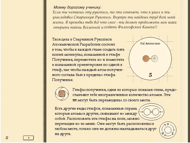 Основная идея игры в том, что вы – алхимический инженер, наставник которого оставил ему книгу, содержащую работу всей его жизни с собранным в ней знанием. И вы начинаете постепенно открывать главы этой рукописи, решая всё более сложные задания глав.