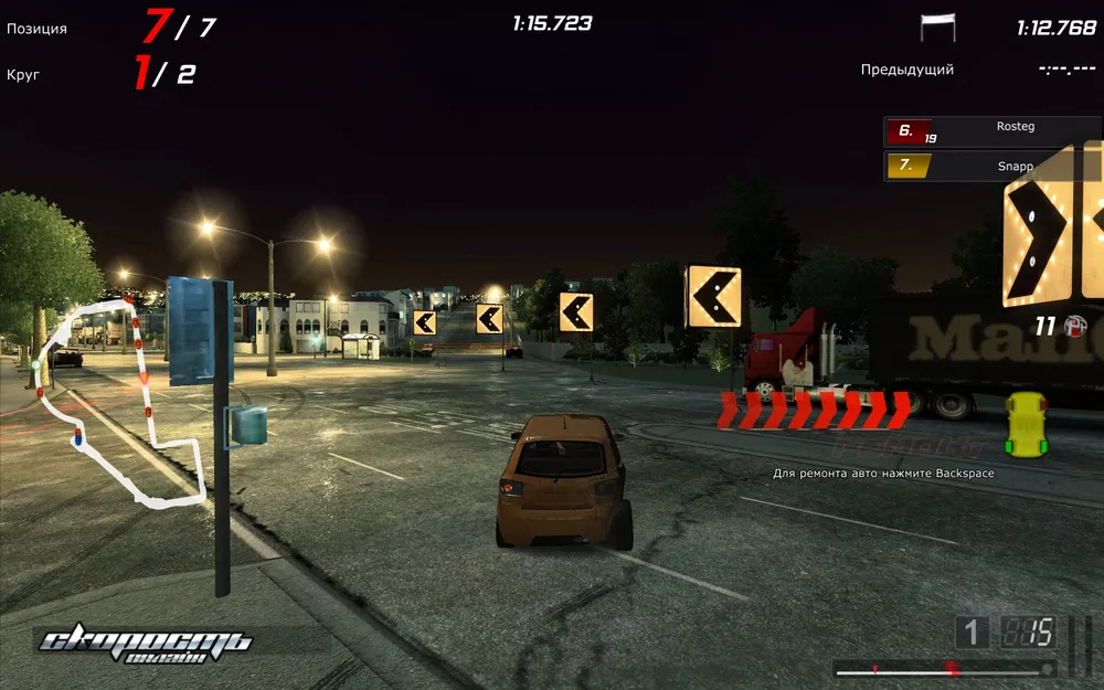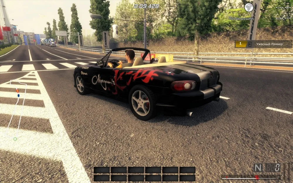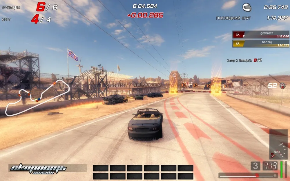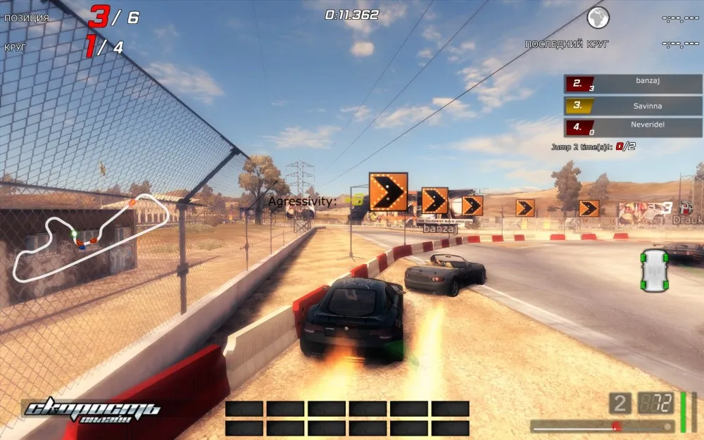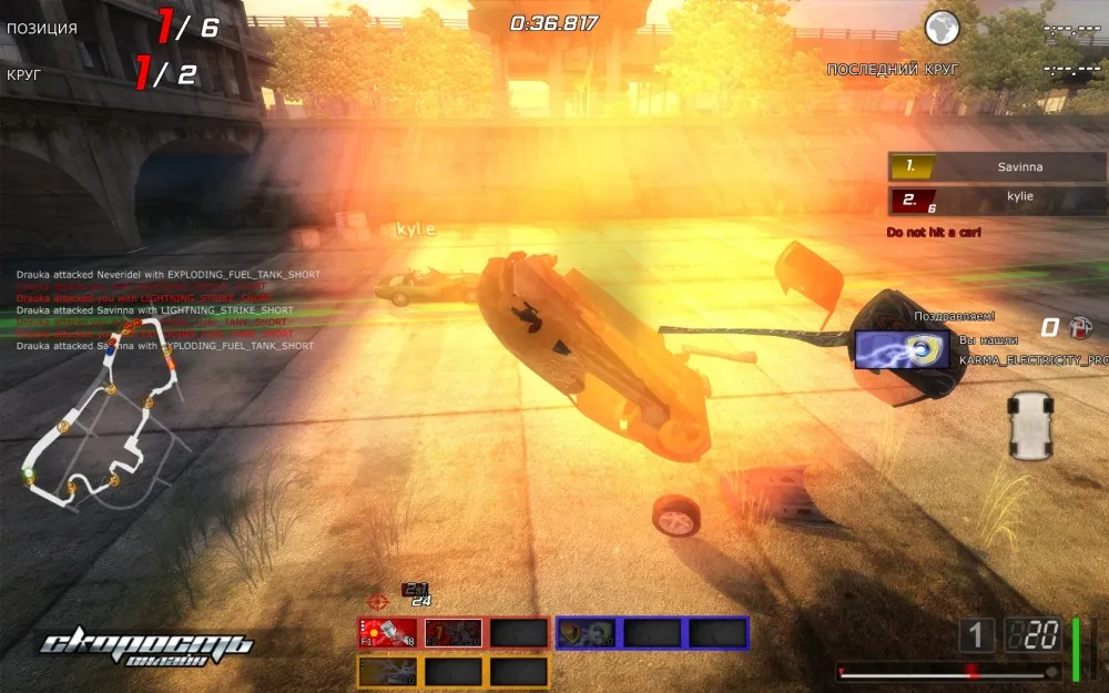 При нажатии кнопки PrintScreen игра на секунду замерала, играть был не удобно, я пытался сбить столбы и деревья (даже самые тоненькие деревья не убиваемые), но мне этого сделать не удалось, система повреждения работает так себе, то что должно убить машину, ее не убивает, не удалось перевернутся. В итоге приехал я последним.