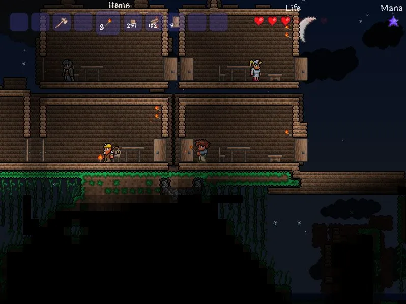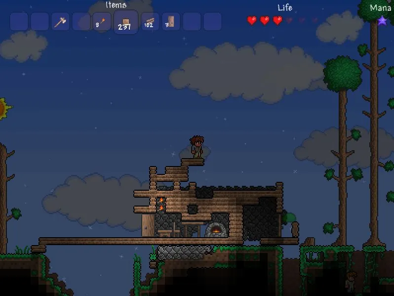 Ну что же, начинаем выживать. Для начала нам понадобится построить дом, чтобы пережить первую ночь. Что-то напоминает, верно? Берём топор и идём срубать дерево, получаем достаточно древесины для постройки дома, строим. Ставим дверь, стул, стол, факела, стены для нашего домика. Отлично, вот домик и готов, но вам придётся потесниться, вместе с вами будет жить Гид, первый NPC в игре.