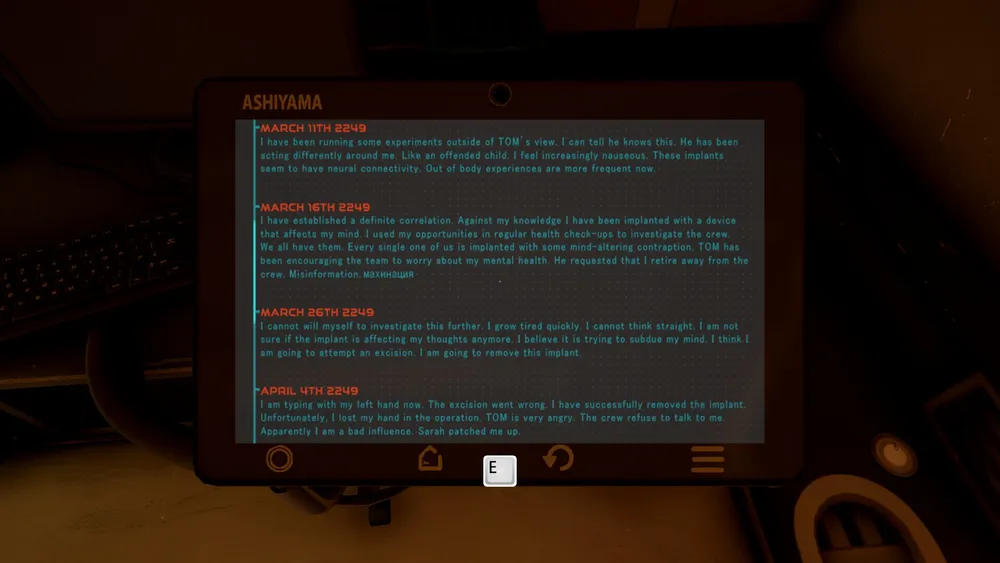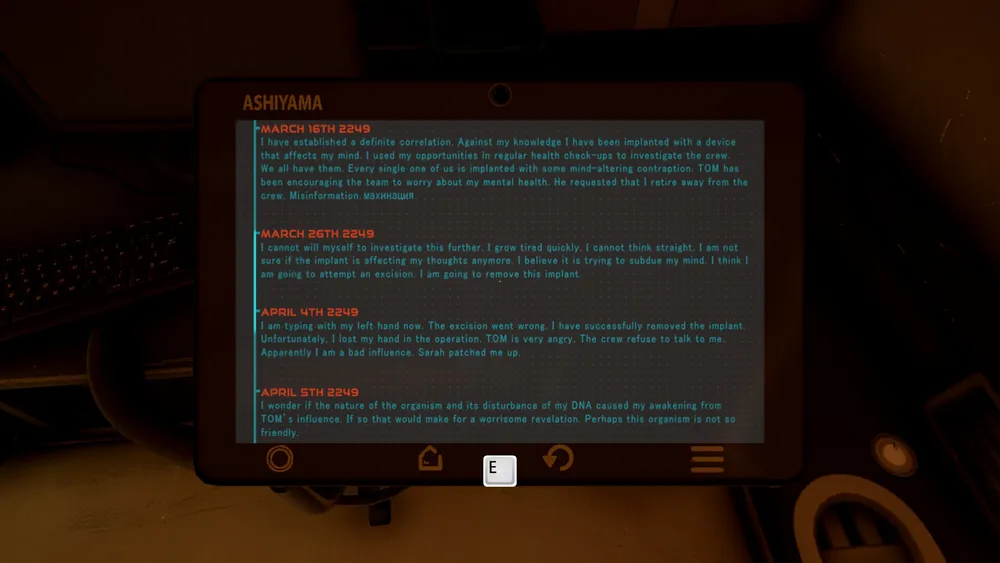 Зайдя в комнату доктора Михаила Токарева, можно прочесть его дневник: в каждого из членов экспедиции вживлен чип, с помощью которого Том контролирует ситуацию. Если действия человека серьёзно противоречат установкам Агентства, Том вмешивается на физиологическом уровне и того сильно «штормит». Док пытается донести до коллег, что действия Тома заходят уж слишком далеко, предлагает удалить чипы, но сталкивается с осознанным или нет, но серьёзным противодействием. Тогда он решается на отчаянный шаг и самостоятельно удаляет свой чип, теряя при этом руку. На этом всё – о судьбе Михаила мы больше ничего не узнаем.
