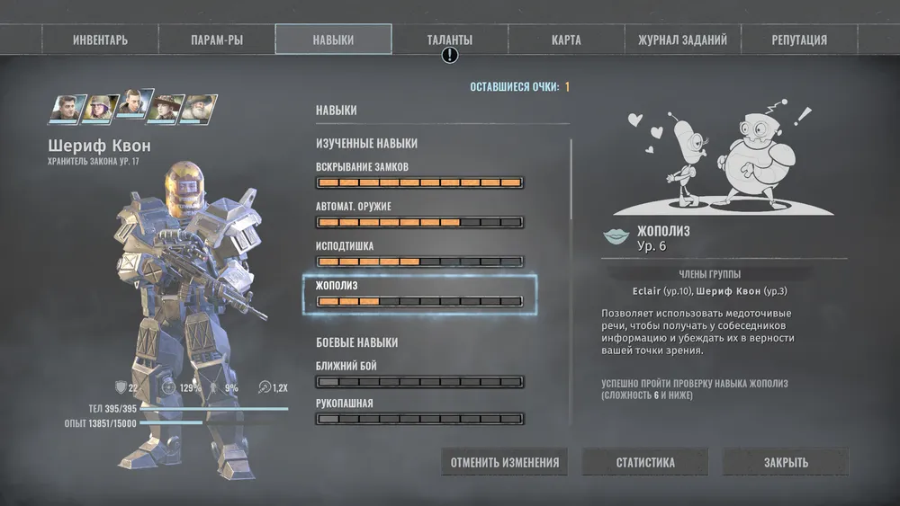 Пусть во главу угла здесь поставлены тактические сражения, на окружающую реальность мы воздействуем не только пистолетом, но и добрым словом. Вспоминаю как недавно проходил Neverwinter Nights, где прокачав убеждение, можно было стать Цицероном и, расслабившись, побеждать во всех диалогах. Здесь же - нет. Если вы хорошо разговариваете, это не значит, что вы определите, чем болен персонаж, или не сможете переспорить оппонента-программиста. Разветвленность прохождения сильно зависит от наших навыков, почти от ВСЕХ навыков, но все же среди них есть особо полезные, например я выделил «must have»: открытие замков и всезнайка. Если выбрать отряд, в котором грамотно распределены навыки, то от игры вы будете получать максимум возможностей. А таланты (которые мы получаем каждые два уровня после четвертого), на мой взгляд, отходят на второй план - бонусы от них не имеют большого преимущества, как например бонусы из 1 и 2 Fallout, и без прокачки талантов вполне можно побеждать, ни в чем себе не отказывая.
