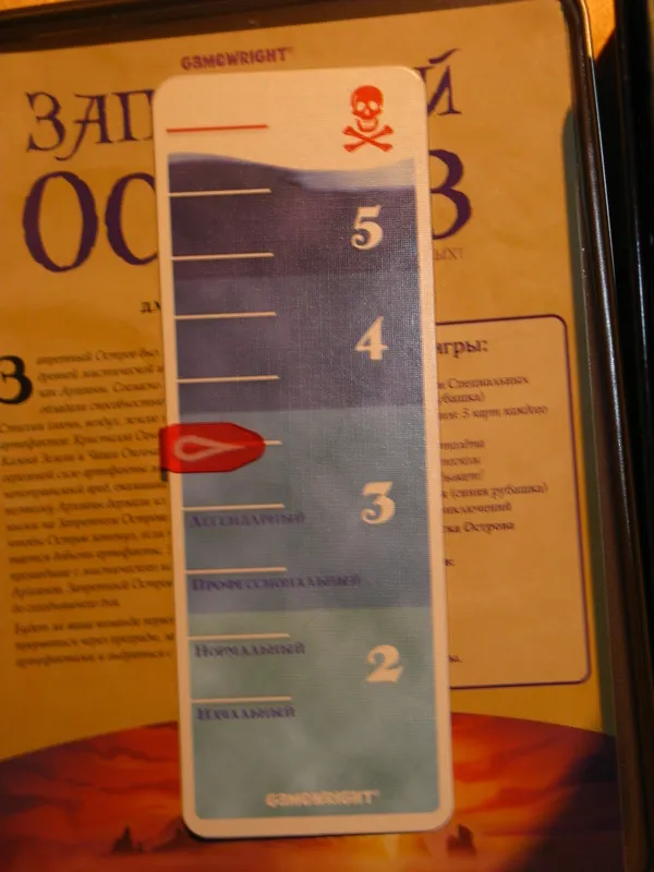Потом рядом с островом кладется водометр, на который цепляется маркер. В зависимости от вашего уровня игры и уровня самоуверенности можно выставить сложность. Цифры на шкале означают сколько участков острова каждый ход будет тонуть.