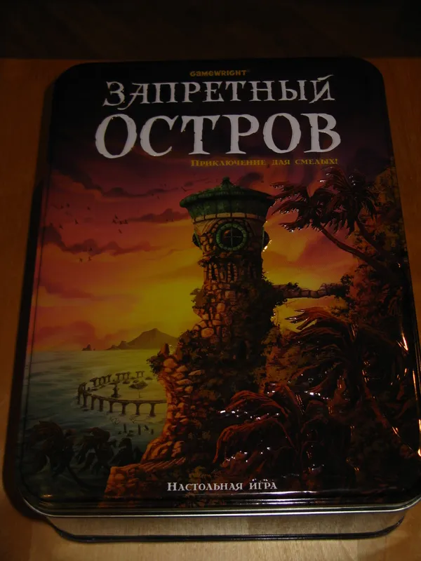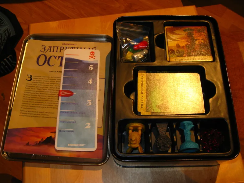 Коробка. Не очень большая, толстенькая жестяная коробочка с прекраснейшей (это слово применимо ко всем артам игры) полиграфией и рельефной крышкой. На крышке - очень красивое изображение маяка (одна из локаций острова) и название игры. На задней части - описание игры и комплектация.