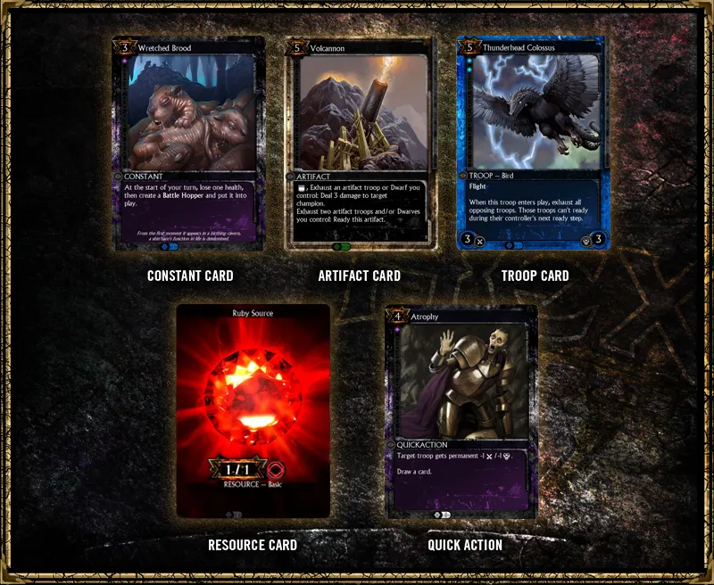 - В колоде могут быть такие типы карт, как Войска, которые могут нападать, блокировать и использовать умения, Постоянные, которые, будучи сыгранными раз, имеют постоянный эффект, Действия бафают войска, наносят урон вражескому герою, их можно сыграть только в свой ход, но есть и быстрый действия, которые можно сыграть в любое время (кхе…), также есть Артефакты и, конечно, Ресурсы.