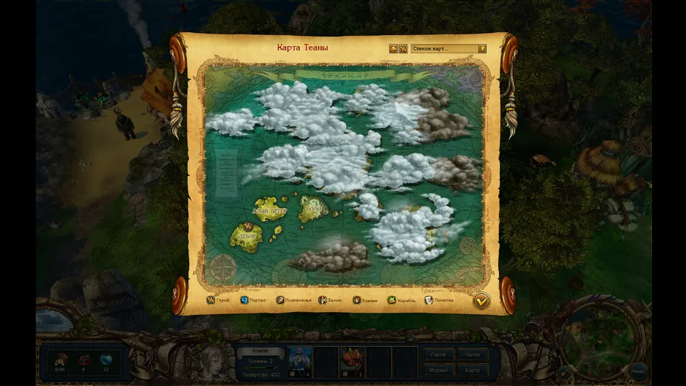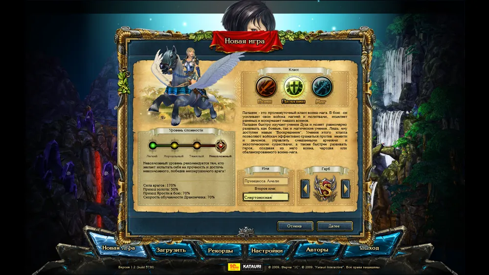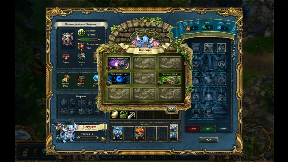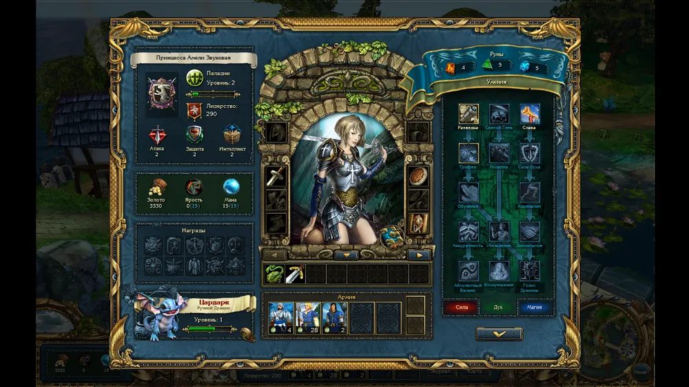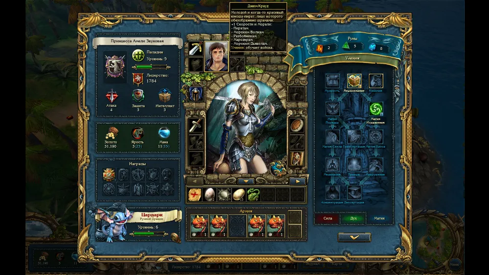 Прежде, чем рассказать о игровом процессе. Рассмотрим героиню и её питомца. Ещё до начала игры, нам дают выбрать класс, сложность, второе имя и герб. Второе имя и герб ни на что не влияют, но все равно приятно. Вот у меня, например, герб змеи на красном фоне, что символизирует Дьявола. Далее, наша героиня может носить различные предметы, повышающие её характеристики и дающие бонусы не только воинам, но и бывает её заклинаниям или на карте мира плюсик какой. Так же с каждым новым уровнем мы получаем руны, которыми изучаем различные навыки. А навыки-то самые разные: от поднятия атаки, защиты или интеллекта, до возможности воскрешать потерянных в бою воинов после сражения. Так же присутствует система достижений. Но это не просто красивая блестяшка на мониторе, а ещё и бонус. То-есть, вот победил без потерь определённое количество раз и увеличил лидерство, которое всегда лишним не бывает. Так же стоит уделить внимание тому, какой мы выбрали класс. Они все получают разное количество определённых рун. То-есть, воин рун силы больше получит, паладин рун духа, а маг рун магии. Так же у них у каждого есть какое-то умение, которого нет у других. Например, маг имеет возможность получить способность "Высшая магия", которая позволяет читать заклинания два раза за раунд.