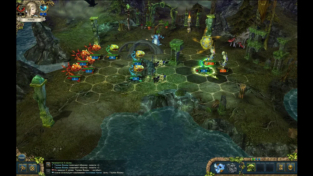 Теперь о сражениях. Бой пошаговый, так что времени подумать у нас есть. Во время своего хода можно использовать магию или дракончика. На магию расходуется мана, а на дракончика ярость. Отличаются они тем, что ярость приходит с атакой и получением урона отрядами, мана же восстанавливается во время отдыха на карте мира, а во время боя она может восполниться благодаря некоторым навыкам, специальным предметам, заклинаниям и ещё у дракончика есть один навык на её восстановление.