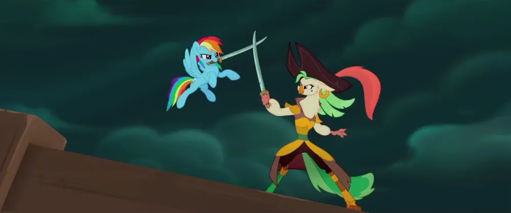 Но именно сильные стороны сериала почему-то в фильм не попали. Что мешало сделать сцену, где Сумеречная Искорка пытается достучатся до Короля Шторма? (Не обязательно успешно.) Или усложнить поняшкам отношения с пиратами? Чтобы помощь от капитана Гарпии не выглядела совсем уж халявной.