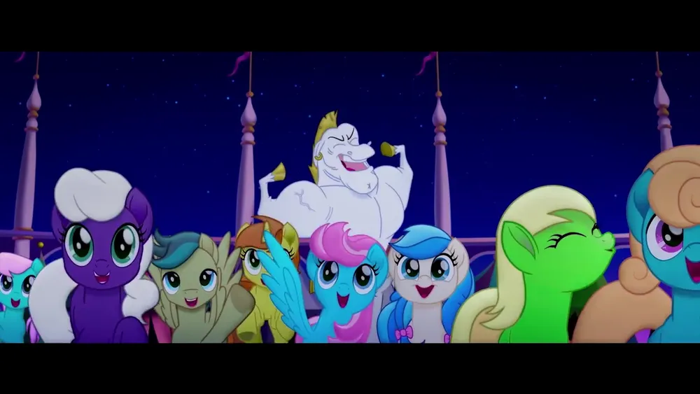 Распиаренное в трейлере подводное королевство, где поняшки отращивают жабры и плавники, длится всего один музыкальный номер. А во время полёта на воздушном корабле всё вообще окружено тучами и никаких красот с высоты.
