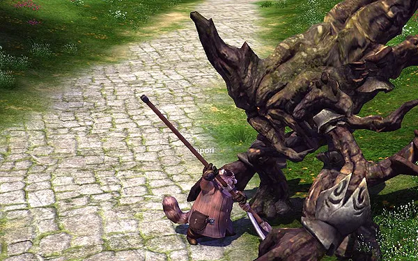 (Данный скилл в TERA выполняет роль «базовой атаки». Удары наносит по-разному — сверху, сбоку, крутясь. Есть шанс сбить с ног.)