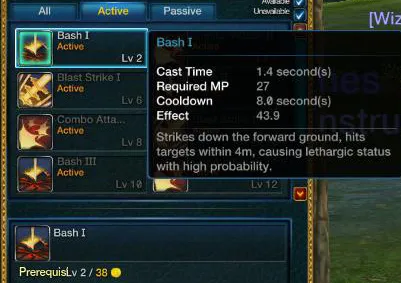 Bash. Сокрушающий удар перед собой, наносит урон целям в радиусе 4 метра, высокий шанс сбить с ног. Требует MP.