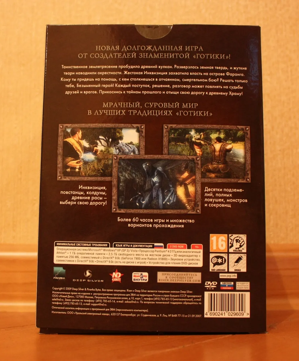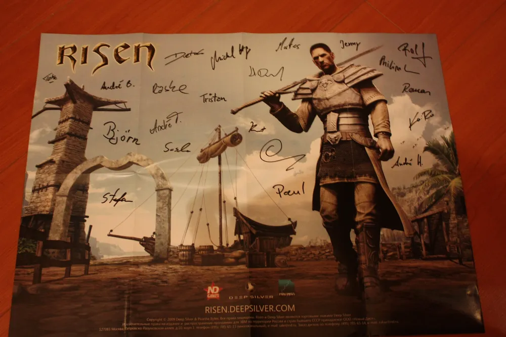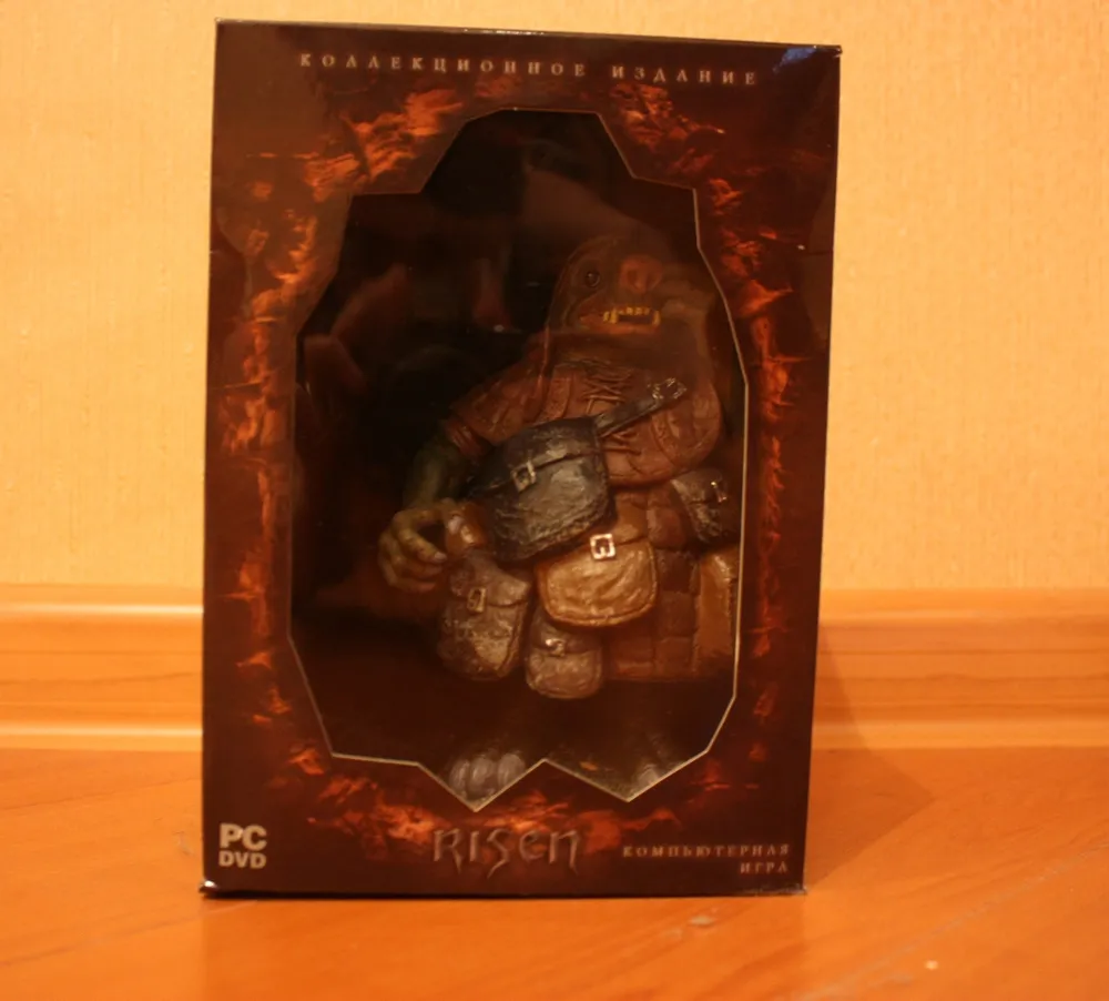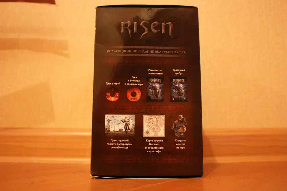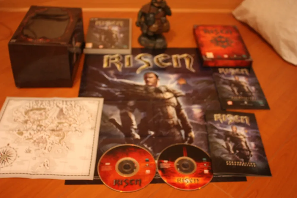 Risen – первая игра от Piranha Bytes, которая получила в России коллекционное издание. Реальное, а не ”так называемое”. DVD-box первой Готики от Snowball.ru содержал лишь мануал. Коллекционное переиздание ее же от Руссобита отличалось лишь добавлением переведенной модификации Диккурик (не знаю, был ли там мануал, но это в принципе неважно – для коллекционки его мало). Gothic 3 также имело DVD-box издание, оно было немного богаче. Помимо мануала, там лежал маленький железный, зеленеющий со временем амулет. Но все это ничто, по сравнению с тем, что может предложить нам подарочное издание Risen (стоимостью 799 рублей). А уж о коллекционном (1499) и говорить нечего – издания со статуэткой в России можно пересчитать по пальцам одной лапы карла: Кодекс Войны, Lineage 2, Warhammer – Печать Хаоса да Warhammer Online. Причем в последних двух это были не совсем статуэтки, а миниатюры – маленькие пластмассовые фигурки, которые надо было раскрашивать самостоятельно. Так что Risen – третье издание в России с полноценной фигуркой внутри.