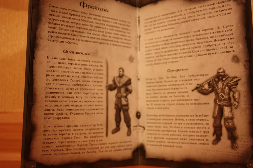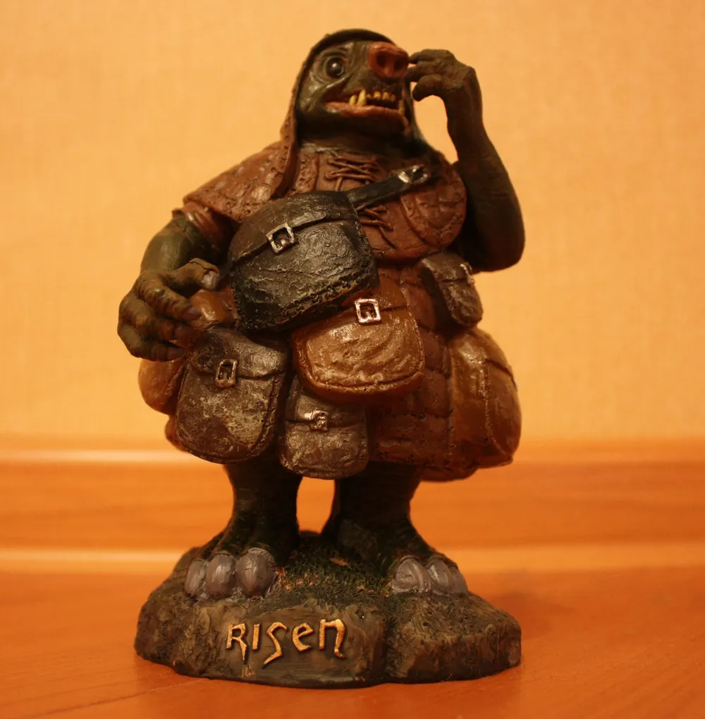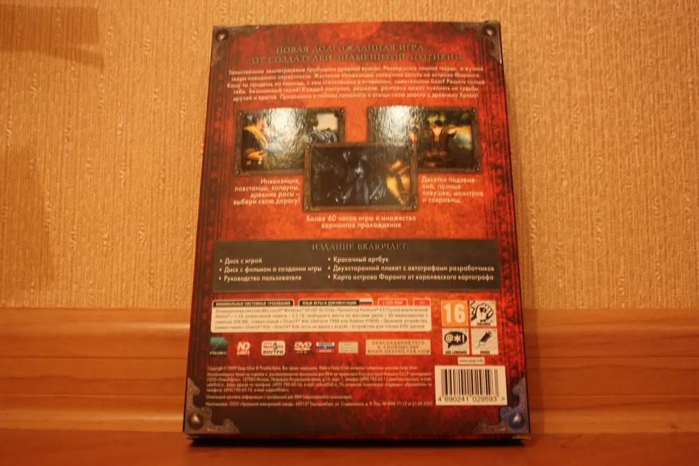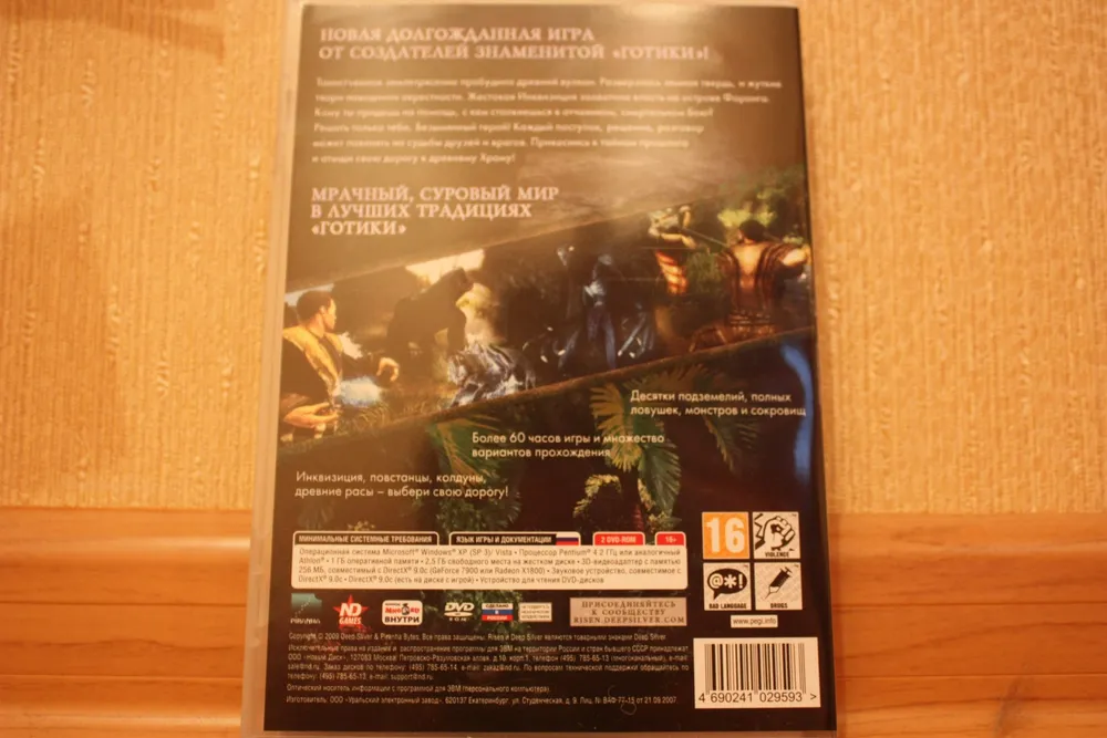 Risen – первая игра от Piranha Bytes, которая получила в России коллекционное издание. Реальное, а не ”так называемое”. DVD-box первой Готики от Snowball.ru содержал лишь мануал. Коллекционное переиздание ее же от Руссобита отличалось лишь добавлением переведенной модификации Диккурик (не знаю, был ли там мануал, но это в принципе неважно – для коллекционки его мало). Gothic 3 также имело DVD-box издание, оно было немного богаче. Помимо мануала, там лежал маленький железный, зеленеющий со временем амулет. Но все это ничто, по сравнению с тем, что может предложить нам подарочное издание Risen (стоимостью 799 рублей). А уж о коллекционном (1499) и говорить нечего – издания со статуэткой в России можно пересчитать по пальцам одной лапы карла: Кодекс Войны, Lineage 2, Warhammer – Печать Хаоса да Warhammer Online. Причем в последних двух это были не совсем статуэтки, а миниатюры – маленькие пластмассовые фигурки, которые надо было раскрашивать самостоятельно. Так что Risen – третье издание в России с полноценной фигуркой внутри.