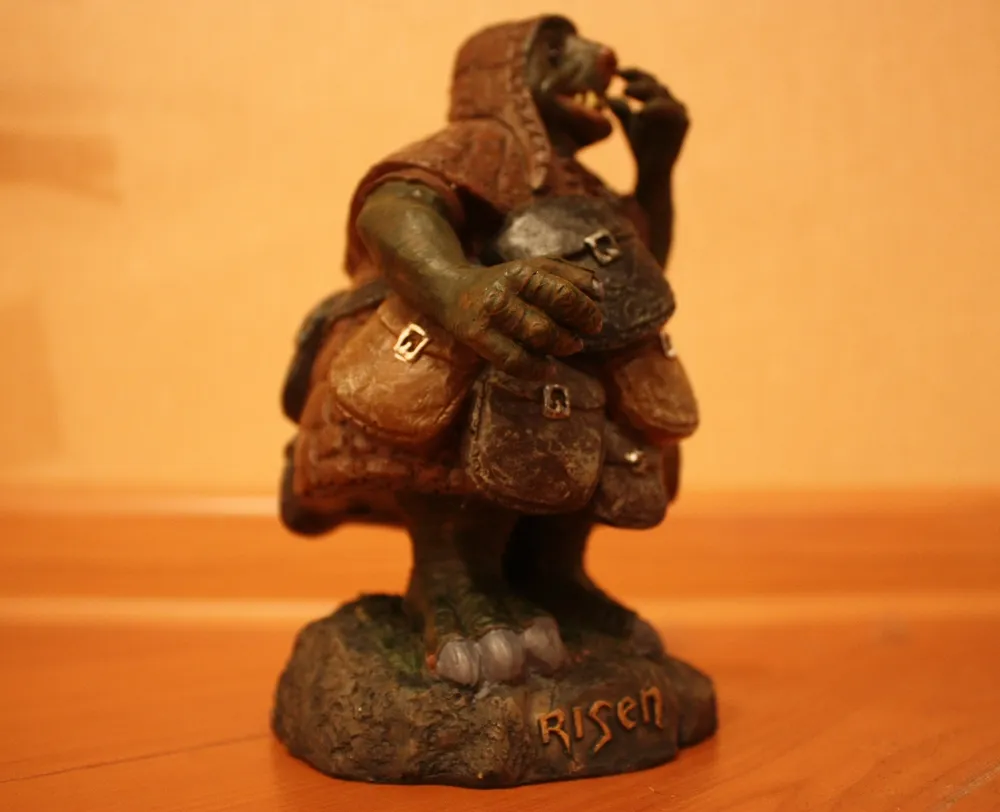 А теперь, то, ради чего стоит купить эту коллекционку – фигурка карла. Красиво и качественно раскрашенная, высотой 16 см, полая внутри. Материал сказать не берусь, но она довольно легкая. Кстати, в офисе Piranha Bytes стоит такая же фигурка, но только с сигаретой в правой руке! откуда я это знаю? Пока не скажу!