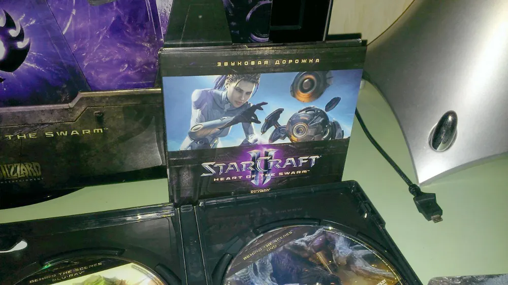 - Диск с музыкой из игры, его я послушал в первый же день на работе, некоторые композиции это переделанные треки из WoL, другие же полностью новые. В целом неплохо, но в отличии от тех же саундтреков из WoW, которые можно слушать и просто так, с музыкой из HotS такой номер не пройдет.