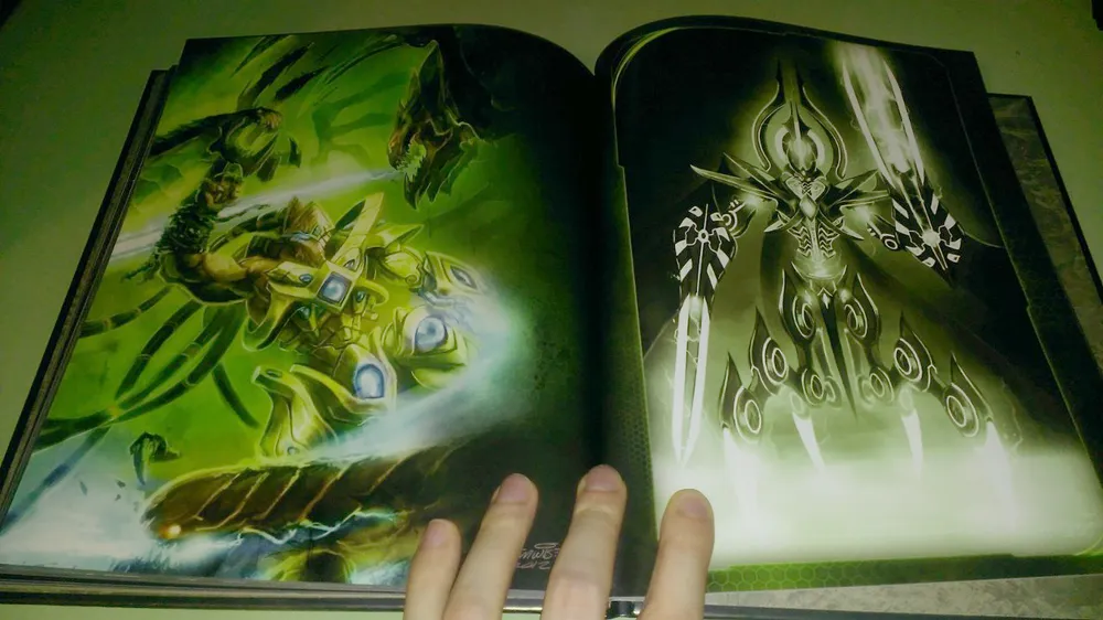 Тем не менее позволю себе немного критики относительно книги HotS - артбук явно беднее чем в WoL. В нем в основном встречаются арты по роликам (синематик и ингейм брифинги), изобилия концептов новых боевых единиц нет, практически все занято иллюстрациями загрузочных экранов. Книга еще "свежая", поэтому страницы пришлось придерживать рукой, чтобы не закрывались, вот некоторые из иллюстраций: