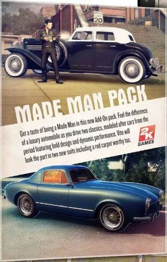 Далее у нас идёт эксклюзивное дополнение - Made man pack, входящий только в коллекционку и на торрентах, но только для пираток. В него входят также как и в renegade pack 2 костюма и 2 машины в стиле культурнейших людей. То есть обычный пиджак с очками и смокинг. Машины уже и не припомню, но тоже красивые. На уме всплыл лимузин...ах да! Точно, лимузин, а вот вторую уже точно не вспомню.