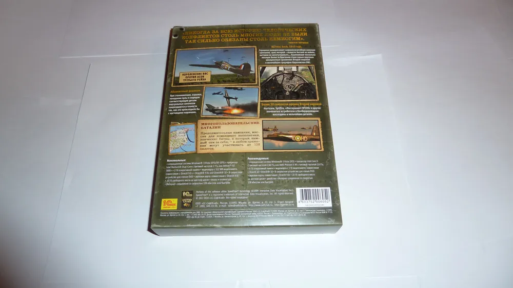 Хоть она (коробка) и не отличается от других коробок с сувенирами, выглядит всё равно хорошо. Выступают некоторые детали издания, глянцевые буквы, плотный картон. Качественно одним словом. Сама коробка сделана в виде материала, из которого сделаны военные самолеты. Ещё главная картинка самолёта сделана как будто во вставке. Выглядит вся коробка красиво. Сзади описание игры и цитата из жизни Черчилля, системные требования. По бокам издания глянцевые выступающие буквы.