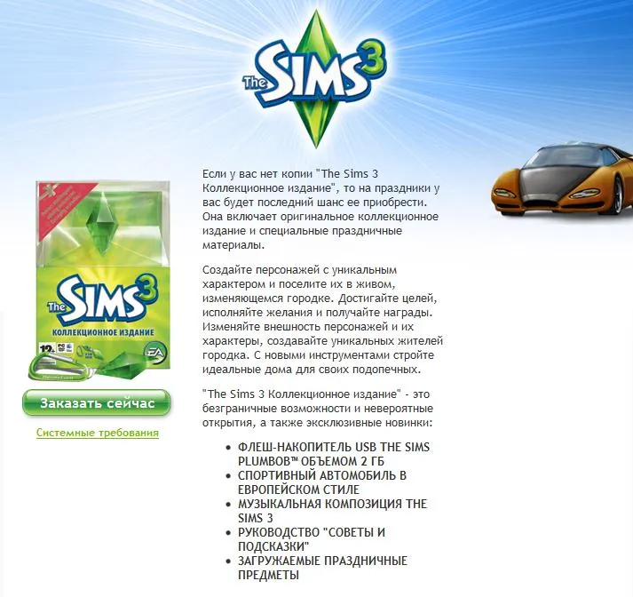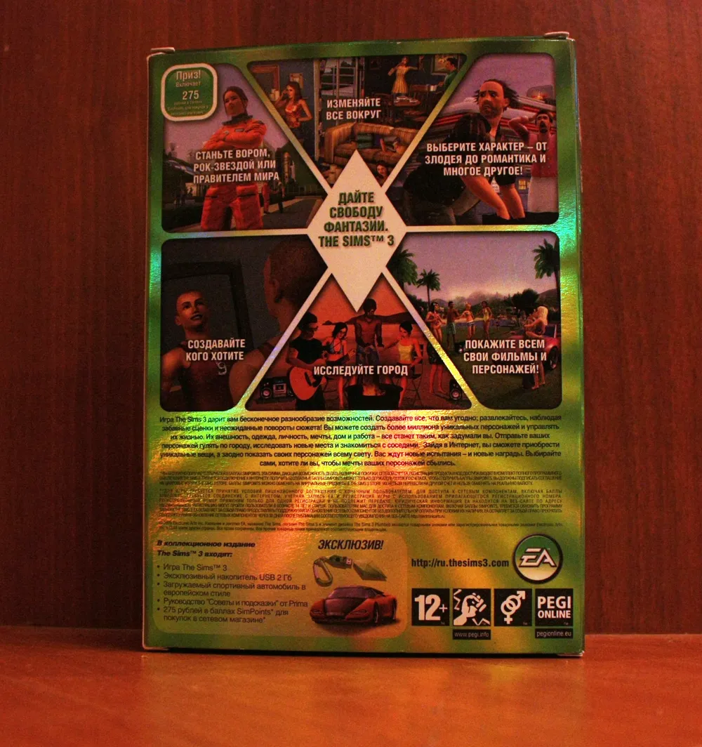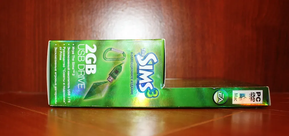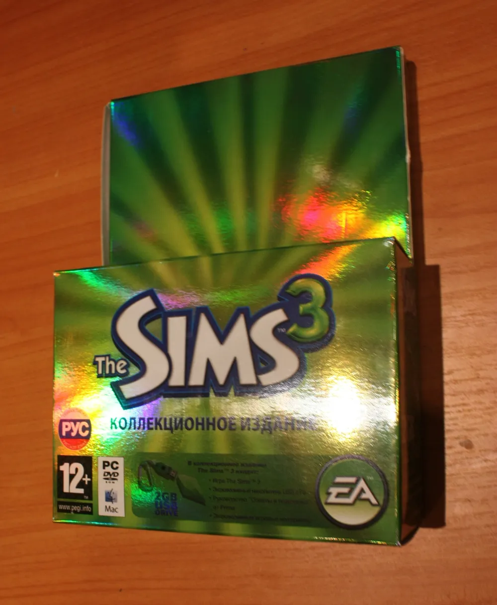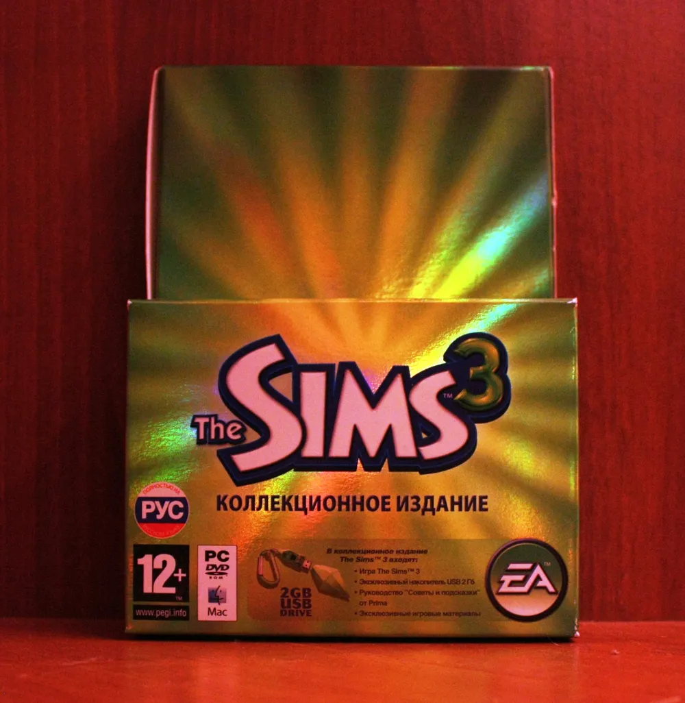 Коллекционное издание Sims 3 также шикарно. В нем собраны как цифровые, так и реальные бонусы (не нравится мне слово “физические”). Стоило оно 1499 рублей, и весь тираж был распродан к сентябрю, менее чем за три месяца. Обложка красивая, переливающаяся: