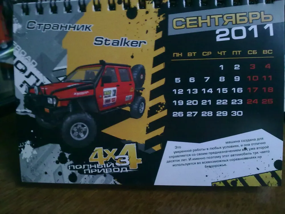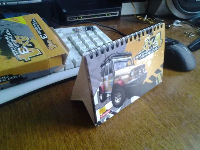 Календарь настольный на 2011 год, не очень большого размера, но очень качественный. Листы и типография выполнена на высоком уровне, не те что в роспечате по 50р продаются. На каждой странице есть как собственно сама разметка дат и арт автомобиля из игры с его описанием (на каждой странице разный естественно). Если вы любите серию 4х4 или вообще любитель такого вида спорта то он безусловно приживётся у вас на рабочем столе.