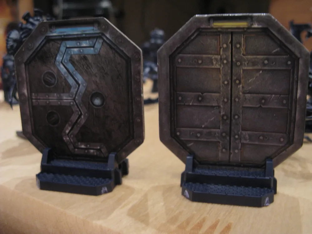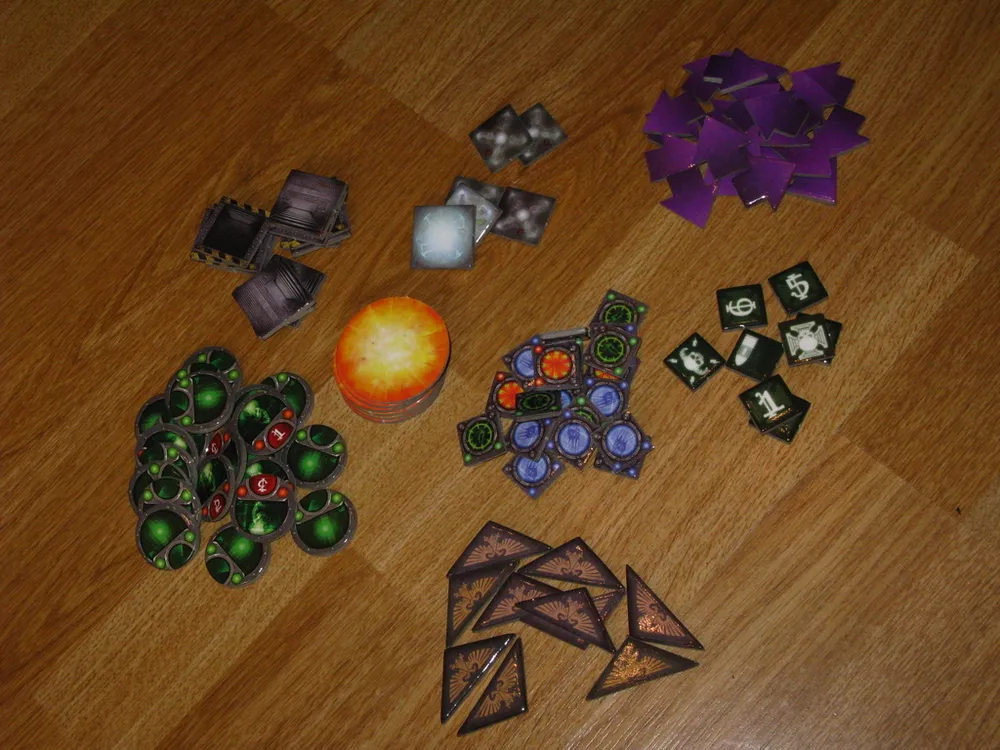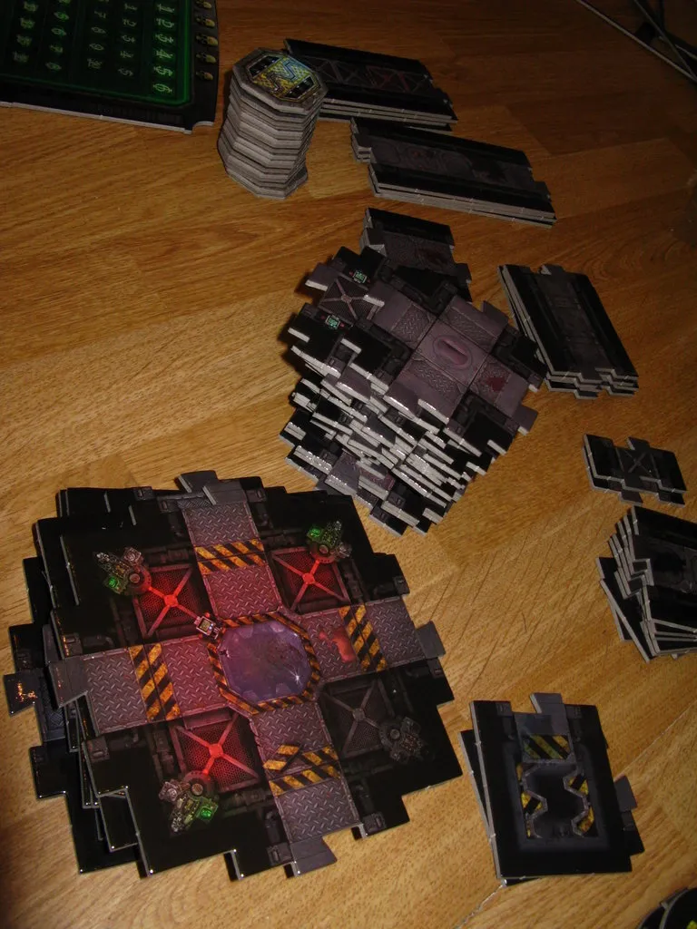 Во-первых, все тайлы сделаны из очень толстого картона, примерно 5 мм толщиной. Печатная поверхность глянцевая. Рубашка черная, лицо - с прекраснейшей полиграфией. С лицевой стороны все тайлы обладают одной особенностью, выгодно отличающей их от собратьев - они рельефные. Да-да, на тайлах есть рельеф, который пусть и немного условно, но повторяет рисунок и очень сильно повышает атмосферность игры. Так же спешу заметить, что в игре нет двух одинаковых тайлов (кроме наверное дверей). Арт на каждом тайле отличается от других. И это, черт возьми, здорово!