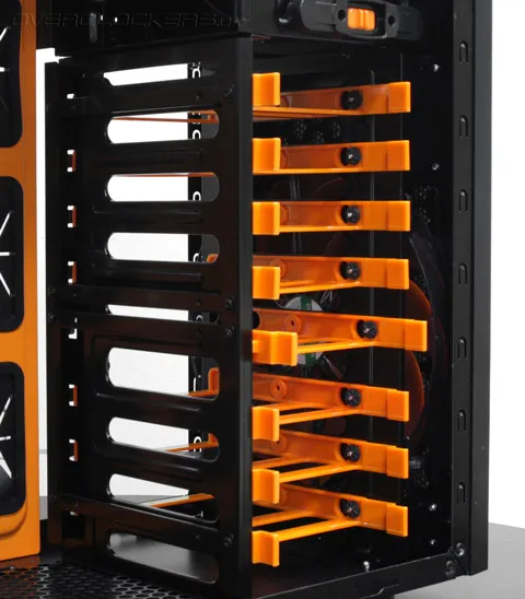 Большую часть передней панели занимает стойка для накопителей, на которой с внутренней стороны имеются два посадочных места под 120-мм вентиляторы.