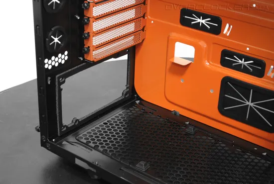 Поддон для материнки выполнен из стали, в котором предусмотрены отверстия и возвышения, которые упрощают монтаж комплектующих и укладку проводов, отверстия для кабелей так же прорезинены.
