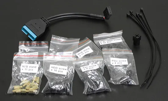 В комплект входят: набор крепежных винтов, 5 стяжек, переходник для подключения кабеля USB и маленький пластиковый ключ для закрепления стоек в поддоне для материнской платы.