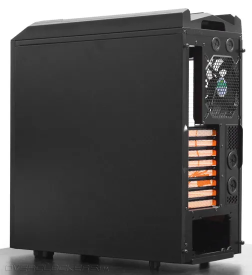 Конструкция задней панели ничем не удивляет. Внизу крепление для блока питания, выше посадочные места под карты и пара прорезиненых отверстий для СВО.