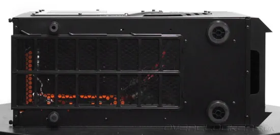 В верхней части находятся отверстие под заглушку разъемов ввода-вывода материнской платы и посадочное место под 120-мм вентилятор, над которым, размещены еще два отверстия под шланги СВО.