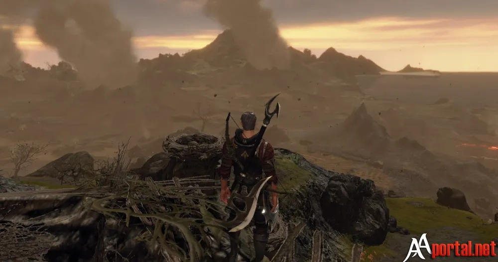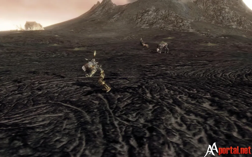 Если идти дальше на восток, то местность становится всё менее привлекательной. Дорога постепенно исчезает и под ногами появляются пласты черной застывшей лавы. Вот теперь мы именно в том месте, которое можно наблюдать с Полуострова Солзриид. Повсюду торчат жерла вулканов и в любое время суток тут вечер. С неба на локацию медленно спускаются кусочки пепла.
