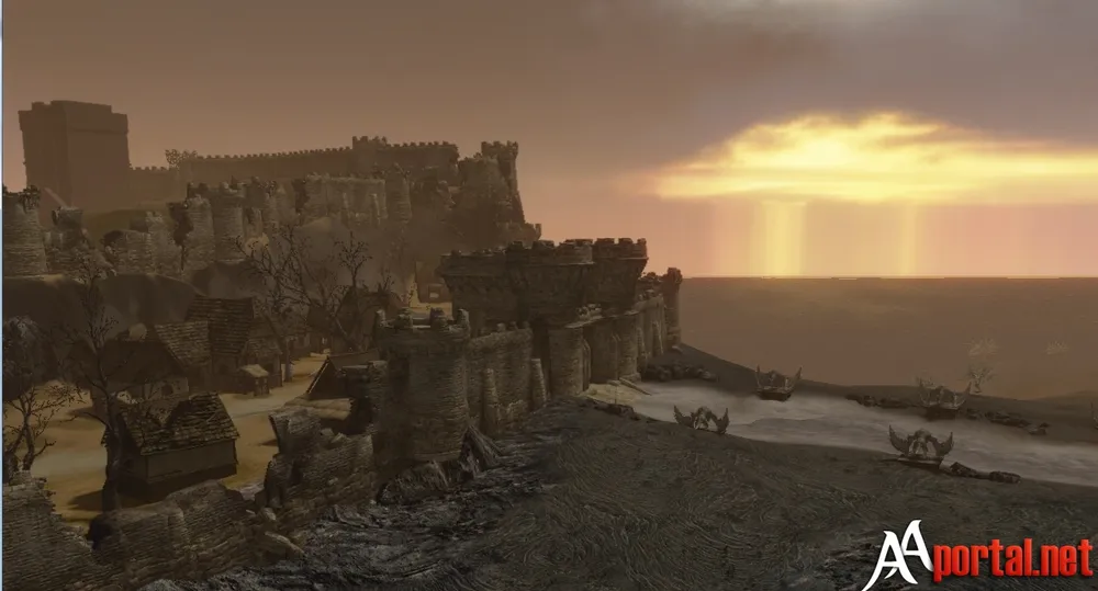 Неподалеку от этого причала (то самое место куда приплывают люди с Полуострова Солзриид) находится холм, на котором находится большая крепость. К этой крепости ведет дорога. По обе стороны от этой дороги стоят каменные статуи с крылатыми созданиями на них. Войдя за ворота крепости я увидел разрушенные строения и кучу агрессивно настроенных разбойников. Естественно я поспешил поскорее скрыться из этого места.